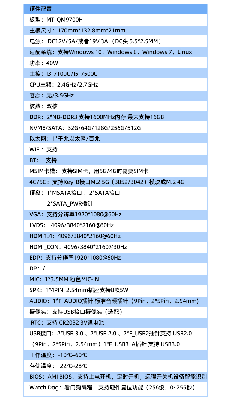 MT-QM9700H-UA主板支持搭載英特爾賽揚系列,I3/I5/I7處理器。MT-QM9700H-UA屬于高性能X86架構產品,基于先進制程,并支持多種操作系統!